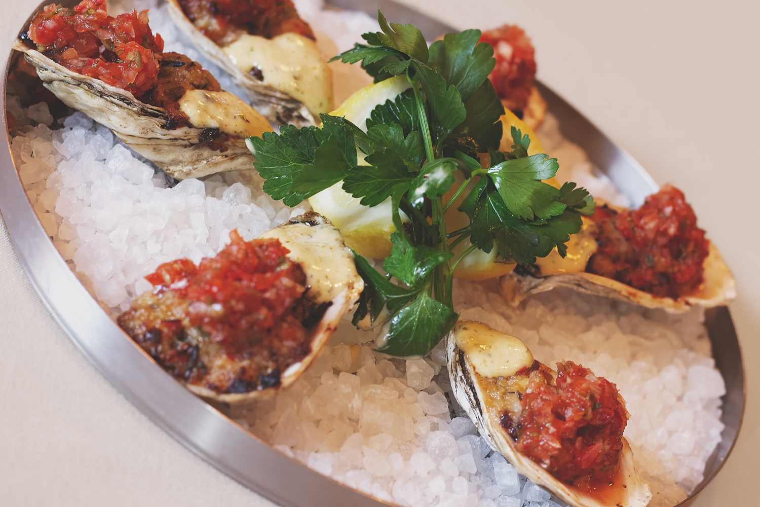 Crab Salad (Small Plate) Oysters Casino (Small Plate) Tomato Salad (Small Plate) Crab Louis (Small Plate) Thai Crab & Green Mango Salad (Small Plate) Porcelette (Large Plate) 8 oz Filet Mignon (Large Plate) Salmon (Large Plate) Iberico Pork Roast (Large Plate) Peanut Butter Crunch Cake (Dessert) Pistachio Lemon Cake (Dessert) Beer Old Fashioned